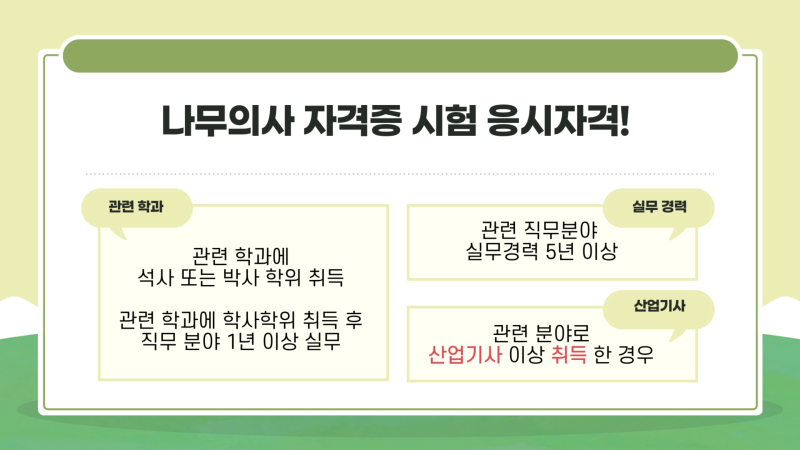 저는 해당 학력이나 경험이 없어 나무의사 지원자격을 갖추지 못했습니다. 하지만 나무의사 시험자격 중 관련 산업기사를 취득하여 요건을 충족할 수 있었습니다.